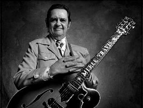 ![]() ファーザー・オブ・ロカビリー・ギター ― マール・トラヴィス オーッス!! ギター抱えて、威勢良く挨拶すれば、気分はもう、田端義夫! と、まあ、かなり旧い、昭和レトロなノリで始まりましたが、 頑固8鉄でございます。 THE KINGの読者において、ギターといえば、田端義夫でも、ジミー・ペイジでも、ナルシソ・イエペスでも、南こうせつでもなくて、やっぱ、カール・パーキンズ、スコティ・ムア、クリフ・ギャラップ、ポール・バーリソン、といった人たちでしょう。 彼らは、みな、初期のロカビリー音楽の特徴的なサウンドだったエレクトリック・ギターサウンドを代表するギタリスト達でして、それぞれ独自のスタイルがあり、それぞれがロックギターのパイオニアなのですが、実は、基本となるテクニック、源流はひとつ。 それは、現在、奏法の創始者であるギタリスト、マール・トラヴィスの名をとって、「トラヴィス奏法」と呼ばれています。 ロカビリーが出てきだした50年代初頭、最も人気のあったカントリー音楽系ギタリストの代表格はチェット・アトキンズで、もともとカントリー・ギタリストが多かった初期ロカビリーにおいては、アトキンズをお手本にしていたギタリストが多かったのです。 そして、その当のアトキンズがお手本にしたのが、マール・トラヴィス。 トラヴィスは、本流であるカントリー・ギターのみならず、ロカビリー・ギター奏法の父だということも出来ると思います。 トラヴィスの出身地である、ケンタッキーの音楽といえば、フィドルが「にーたかにーたか」いってるブルーグラス音楽と相場が決まっていますが、トラヴィスは、ブルーグラス・ギターのテクニックにおいても多大な影響力をもつことになります。 さらに、あまり知られていませんが、トラヴィスは、ソングライターとしても第一級のヒットソングを作っています。最も有名なのは、「シクスティーン・トンズ(16トン)」でしょう。トラヴィスは1970年にナッシュヴィル・ソングライターの殿堂、1977年にカントリーミュージックの殿堂入りをしてもいます。しかし、なんといっても、彼の名が不滅なのは、そのギター奏法にあるのです。 ![]() マール・ロバート・トラヴィスは、1917年、ケンタッキー州のローズウッドで、炭鉱労働者の家庭に生まれました。最初は、兄が手作りしてくれたギターを弾くところから始めたのだそうです。 地元で最初にトラヴィスの目を引いたギタリストは、モース・モルツ、違うな、モース・ラガーという人で、ラガーは、親指にサムピックを付け、低音弦でベースラインを弾きながら、同時に人差し指で高音弦側でメロディーラインを弾き、それぞれの指が別の生き物みたいに違うリズムで動く、というなんだか、書いてるだけでややこしいテクニックを駆使していました。(右 写真 左がチェット・アトキンズ、真ん中がラガーさん、右がマールさん) 「もーう!!ややこしやー、ややこしやー・・」なんてネタかましてはいられない、「これだ!もっと面白くしてやろう!」と決心したトラヴィスはラガーを真似ながら、発展させることにしたのです。 ラガーのスタイルは、すでに、地元で多くのギタリスト達を感化しており、その代表は、ケネディー・ジョーンズ とアイク・エヴァリーというふたりのギタリストでした。アイク・エヴァリーは、50年代ロカビリーの有名なデュオである、エヴァリー・ブラザースのお父さんにあたる人です。トラヴィスは、このふたりのテクニックからも多くを学びとりながら、独自の洗練されたスタイルを創り出していきました。←若かりしのマール 1936年、トラヴィスは、インディアナ州の兄のバンドに参加するため、エヴァンズビルに滞在中、地元ラジオ局で「タイガー・ラグ」を披露。まるで、ベースとパーカッションとギターを全部一度に演奏しているように聞こえるトラヴィス奏法は、評判となり、クレイトン・マクミランのジョージア・ワイルドキャッツ、シンシナティのラジオ、WLWのドリフティング・パイオニアーズに参加。 トラヴィスの発展させた2本指奏法は、グランパ・ジョーンズ、デルモア・ブラザース、ハンク・ペニー、ジョー・メイフィスといった、後にカントリー界の大物となっていく、WLWの多くのミュージシャンたちをも感嘆させ、トラヴィスは彼らとの親交を深めていったのです。 彼らは、また、ブルーグラス音楽へも大きな影響を与えた人たちで、ここにトラヴィスがかかわったことから、スタンリー・ブラザースのカーター・スタンリー、ビル・モンローのブルーグラス・ボーイズにいたレスター・フラットなどの、初期のブルーグラス・ギター・テクニック(親指でベースラインを、人差し指でコードをストロークする)へと、トラヴィスの影響が伝播していったようです。 1943年には、シンシナティの中古レコード業者だったシド・ネイサンのところでレコーディングをしていますが、これがもとでネイサンは