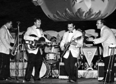 びっくらこいたのはヘイリー本人ですが、もうこうなっては止まりません。とうとう全米どころか全世界を巻き込む大騒ぎとなっていったのです。 こうして世相の変化の中で、社会問題化、社会現象化した、「ロック・アラウンド・ザ・クロック」は、あれよあれよという間に全米ナンバー1、全世界ナンバー1となり、丸顔、小太り、30代、5人の子持ちのお人よしヒルビリー男、ビル・ヘイリーはいつの間にか、反抗期の少年たちが尊敬する「世界初のロックスター」になっていたのでした。 実はここまでは、「やりい!! 宝くじ3億円あったりー!」みたいに景気の良い話なのですが、これから話が複雑になります。 「世界一のトップスター」になり、巨万の富を得たまではよかった。おとぎ話にも後日談ありのことわざどおり、これで話はおわりません。 この「ロック・アラウンド・ザ・クロック」が社会現象になった1955年をもって「ロック生誕の年」とするのが通説ですが、明けて1956年、出るわ出るわ、ロック野郎。ネコも杓子も芋虫もみんな合い言葉は「ラケンロール」になってしまいました 筆頭はエルビス、カール・パーキンズ、ロイ・オービソン、ジェリー・リー・ルイスなどなどから、もともと、R&Bで比較的過激なスタイルを持っていたチャック・ベリーだのリトル・リチャードだのまで、ブームに乗ってどんどんヒ ットを出す。 というわけで、1957年には、実際は30代のおっさんで、アイドルからは程遠いヘイリーの人気はもう終わっていたのです。 まあ、しかし、フツーのヒトが300年くらいこつこつためても無理なくらいの金額を稼いでしまったのですから、めでたしめでたしのはずだったのです。 ところが、今も昔も東も西も、世間は生き馬の目を抜くくらい恐ろしいところ。ボサッとしてると尻の毛まで抜かれてしまいます。 ここで、ヘイリーの特徴的な性分である「他人を疑わないお人好しぶり」が思いっきり裏目に出てしまいます。 「とんでもないペテン野郎」に資産運用を任せてしまうのです。「単に、昔から友達だから〜」というのがヘイリーの言い分だったそうですが、「友達」と思っていたのはヘイリーのほうだけということに本人が気づかなかったのが運の尽き。 ほとんどすってんてんになったのも知らずにタカをくくっていると、挙げ句の果てに有り金持ち逃げで行方不明という鬼の世間ではよくある話。今度は自転車程度ではすみません。 バブルマネーは身につかないとよくいったもので、気が付いたら一生かかっても払いきれないような巨額の借金だけが残っていたのでした。 しかし、ボーッとしてても誰も助けてくれません。もう一頃のような人気は望めないものの、高いギャラがとれるうちに働きまくらなくては、と、世界中をツアー、というかドサ回りし始めますが、1963年ごろからは、いわゆるリバプール時代でビートルズがヤアヤアやってきたりして、もう大変です。 60年代後半のコメッツ(左から、アル・ラッパ、ルディー・ポンペリ、 ビル・ヘイリー、ニック・ナストス、ジョン"バンバン"レイン) なんとか活路を見いだそうと、ヘイリーはコメッツを連れて、西部 劇の悪漢のごとく、メキシコへ拠点を移しました。