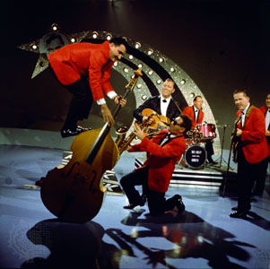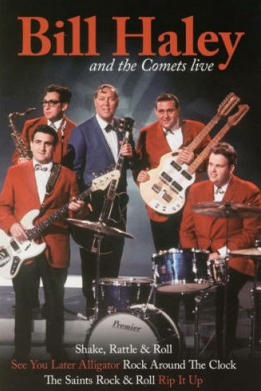 | 55年〜第2期コメッツ(左から、ルディー・ポンペリ、アル・レクス、ジョニー・グランデ、ラルフ・ジョーンズ、ビリー・ウイリアムソン、フラニー・ビーチャー。下がビル・ヘイリー。) | ビル・ヘイリーと彼のコメッツ オン・ステージ(50年代) |