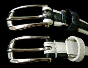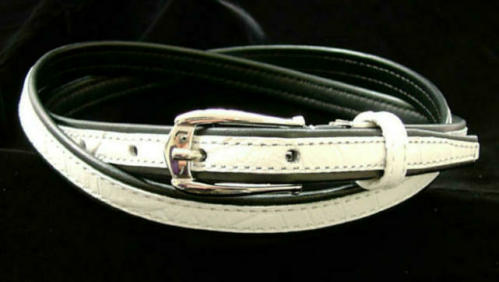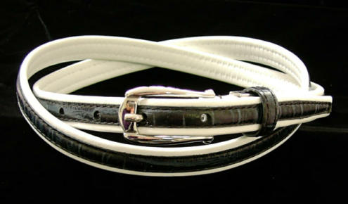 | Belt with thin two-tone color This belt is a white, black, two-tone color and the width is very thin. It doesn't limit it to the rock n' roll world ,it usually became popular in the United States of 50's. The width was 1.5 cm and matched to slacks.In modern days,this type is not popular. However the fan it is unique and with sticking to pays attention to the fact that the rock n' roll stars of 50's had put it on . This belt is gradually a fashion between them. Made of leather of bovine cattle 43inch(the total length) 0.6inch(the width) With adjustment metal fittings made in JAPAN |