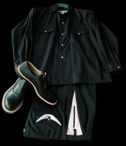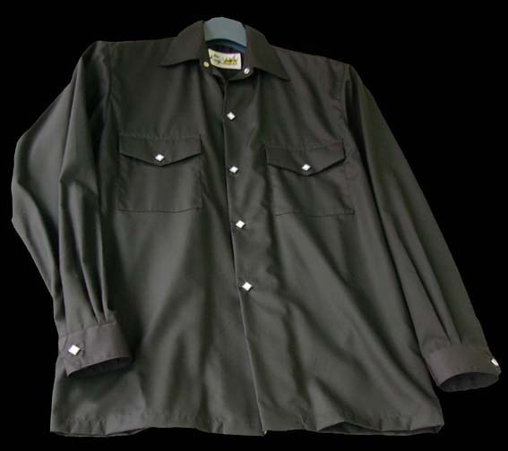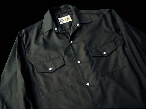 | ヴィンセント・シャツ TSH-010 & TSH-011 〜皆様の絶対的な御要望にお応えして!〜 1957年にジーン・ヴィンセントが着用していた、ブラックコットン地100%のシャツをリアルに再現!ピストルパンツをモノにした方には100%オススメのシャツだ。 変形フラップポケット上をはじめ、正方形のパール調ドットボタンを回転させたことによってダイヤ形に見せている。極めてシンプルだが、ブラックカラーが本来もっているスタイリッシュな反逆性が際立ち、ロカビリースピリッツの原子が溢れている。ピストル・パンツとの組み合わせは、まさにジーン・ヴィンセントそのもの。さあ、「ダンス・トゥ・ザ・バップ」が聞こえてきた! MADE IN JAPAN |