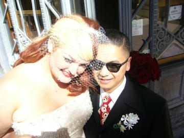 その横にビール片手に穏やかに佇むのがジョニー殿じゃ。 奥様はその豪快な外見とは裏腹な(?)しっかりとした倹約家で、 ジョニー殿の娯楽費つうか大道楽費(失礼!)に目を光らせているらしい。 奥様の厳しい監視の目を潜り抜けながら、ジョニー殿はTHE-KINGにそぉ〜とオーダーをいれてくるらしい。(ジョニー殿に限らず最近のORDERはこのパターンがかなり多く、発送先が会社や営業所止め指定だそうだ。厳しいオクサマチェックの難を避けてくる諸君に告ごう! ついでにわしの酒もつがせてもらおう。 実にグレイトなR&R魂じゃ!!!!!) THE-KINGのアイテムへの欲求が、奥様からの叱責の恐怖に勝っているようで、 誠にありがたい!と同時に、JILLIAN夫人いつも申し訳ございません! ジョニー殿は世界の七つの海を股にかける海運業に携わっており、 この仕事はまた奥様の監視の目から解放される絶好の機会のようじゃ。 どこにいてもTHE-KINGのアイテムが気になって仕方がない!彼は、先日は出張先のイラクからメールをよこしてきよった。 「アメリカに帰還したら、愛するJILLIANと2度目の結婚式をあげるから、それまで俺様用のナッソーを用意しておいてくれっ!」 っつう熱いメッセージじゃった。 結婚式にナッソー!なんというシャレた選択じゃ。 これなら奥様も許して下さることじゃろう。 ふぅ〜 で先日目出度く二度目の結婚式の写真がおくられてきたのじゃが、その前にまず数年前の1回目の結婚式がこれじゃっ!(↓) なるほど、ボックスプリーツナッソーときたものじゃ! やるのぉ〜 |