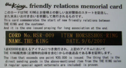 | 誕生! THE KING friendly card 2007年度6月9日より1点\20000以上の品々におきまして、プラスチック製のTHE KING frindly relation memorial cardを発行させて頂く運びとなりました。 また、枚数を所有する事によって、間違いなく何かあるという事で保管して頂きたく思います。 よろしくお願いいたします。 |
