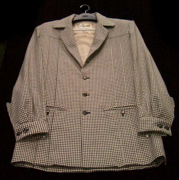 | 番外編 現在京都にて寺めぐりをなさっているガンコ七鉄先生と競い合っていたマーガレット嬢にカンペキにフラれ、傷心旅行からやぁ〜っと帰ってきたっていう今日この頃、皆様の方はいかがでしょうか? 未練タラタラでひきずるものなのよぉ〜男ってもんは!っと世のレディーに告いでおくといたしましょう。だから、ほれ見なさい!今回表紙に登場しちゃたではあ〜りやせんかっ!! そもそもひみつはビリツ・・・の釈ちゃんもイイなんて言ったのが大失敗の始まりでございやんした。ちょ、ちょっとア〜タ! この前、伊東の美咲ちゃんがどうのこうのなんてほざいていたかったぁ〜?なんてスルドイお声が聞こえてきそうですなっ、んな事ばっか言ってるから婚期逃しちゃってって・・・あらまっ、まぁ〜いいでしょうそんな事!! はい、Nassauでしたね。暗〜いトンネルにサンゼンと輝くまぶしい光りを与えてくれるNassauです! Nassauは裏切らない! 今回のBLACK×WHITEのチドリは、昔を思い出させてくれる特別なNassauなんです。事実18年前に手掛けさせて頂いた第1弾であり、初心忘れべからずってなわけでございまして不死鳥のごとくカムバックとなりました。 80年代の後半あたりまでは、ELVISの50年代時の写真そのものがあまり日本に入ってきてなく、またビデオなんかも画像が乱れ悲惨なものがあった気が致します。そんな環境の中で、ELVISの特にまぶしいNassauって言ったら、皆様お察しの通り、例のアレですよ、アレ! そう赤と白のチドリのタイプ。正確に言うと、レッド×ベージュのチドリっぽい感じぃ〜なんて口にしてしまうとオタク的モード炸裂となってしまうんで、アタシャそこまでは知りませんよん。 ただ当時はモノクロの写真しか出回ってなかったので、今だから言えますがこれを白黒のチドリと勝手に解釈してしまったんですねっ実をいうと。その後、カラーで見て赤チェックと知って、ギョエでしたね。チドリのジャケットは色々合わせやすいと思いますよ。なんて、ここでも営業するとはパーカー大差なみの商魂! また、ノーガキはもうエエ! 男は黙ってブラックナッソースーツ・・・・これもありでしょう。だから営業よしなさいって! |