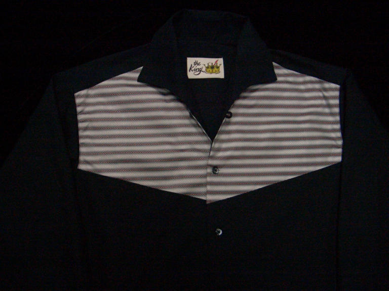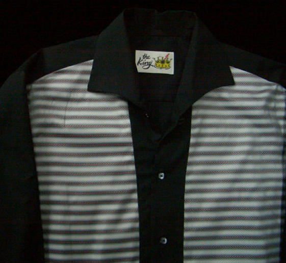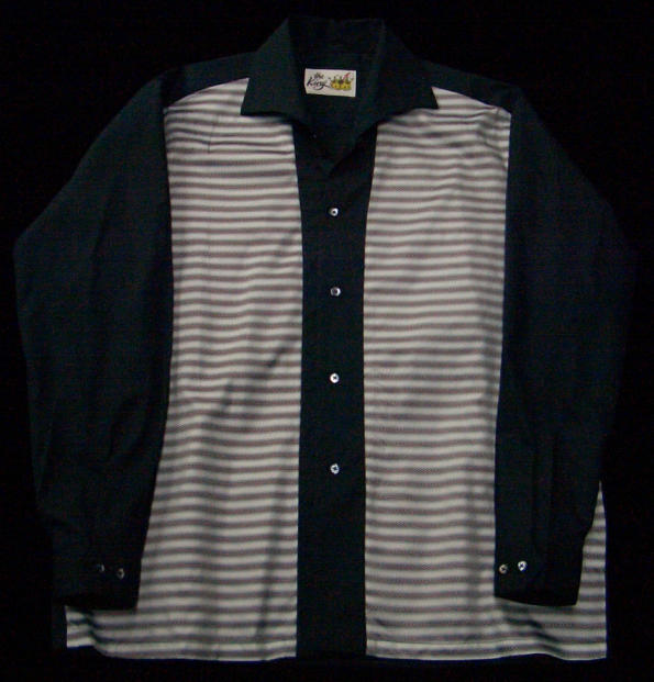 EDITION !〜 イタリアンカラーのブラックコットンシャツに確かなムードの横ジマを切り替えたサイドラインシャツです。50年代のロッカーの多くが、横ジマのシャツをものにしていて、もう言うまでもないという基本中の基本スタイル。活躍する機会が最も多い50's styleのシャツであり、Nassau とイタリアンカラーシャツのコンビネーションは、ただただ美しいの一言だ。 MADE IN JAPAN |