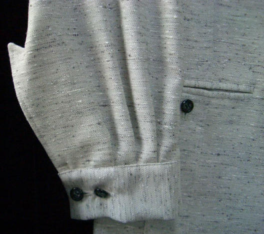 | ボタンが2つ付いた袖口部のみ生地の向きが縦となっているのにお気付きか? 本来の生地の向きをあえて変えてヨコジマのラインを出しているのだ。 |