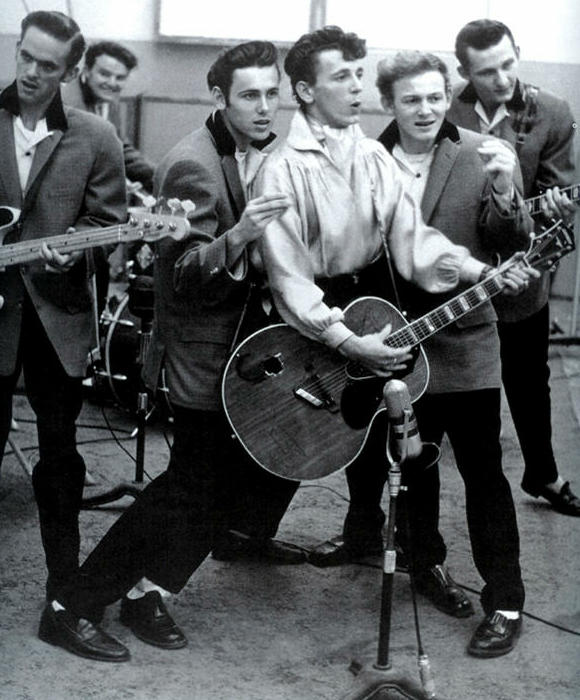 | 誰が何て言おうが、VINCENTっていったらこのショットだ。どうやらGENE大先生はアスコットタイを非常に 好んだと思われる。 なぜグレッチに穴があいてるのかは解らない。 |