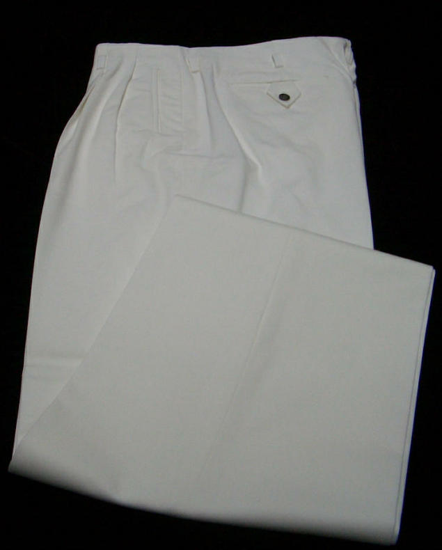 | 2007 NORMAL 50'S PANTS (ノーマルフィフティーズ・パンツ) 〜皆様方の絶対的な御要望にお応えして〜 ナッソージャケットとのコーディネートを前提に仕上げている、絶妙なラインを持つツータック・パンツです。ちょっと薄めだが、ほぼカンペキに近い50's風柄入りとオールシーズンのコットンの純ホワイト。お後は細身ベルトを通過させるのみだ! |