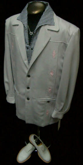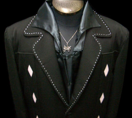 | 〜皆様方の絶対的な御要望にお応えして〜 2008年度の一頭最初一発目の更新は当然のごとくNassauだ! ブラックとグレーのウールギャバジンを用いて、ヒト手間加えた自信作は、まるでピュアロカビリーとネオロカビリーが融合したかのようなかつてないデザイン! 共にしつこくない程度にベビーピンクが持ち入れられており、このワンポイントにひとくせあり!ライブやパーティーにもってこいの生ツバモノのNassau Jacketである! MADE IN TOKYO |