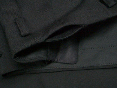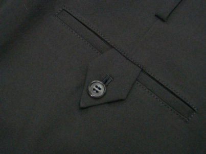 | ディテールにおいてはTP-007と同様でカクシポケットもあり。この手の余計な縫い目がないシンプルなツータックパンツは(腰帯が身頃に続いて一枚仕立てになっているのがポイント)実際は30年から40年代に米国西海岸でかなり流行ったらしくカリフォルニア・ウエストバンドだとかハリウッド・ウエストバンドなんて呼ばれていた。 みたい。 | |