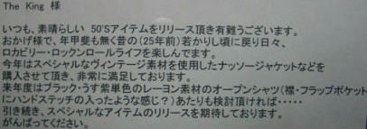 | パンパカパ〜〜ン、パンパンパンッ パンパカパ〜〜ン♪ 皆様、おこんばんは〜どすえ。 今日は朝晴れていたのに、冴えない天気となったと思ったら夕方から冷たい雨の関東地方。 あらぁ〜? 更新してないじゃないのよぉ〜なんてお思いの事でしょうけれども、とにかくようこそ! え〜 当初の予定では本日、今年最後の更新を考えておりましたが、クリスマス前に 「んでは皆様良いお年を! ごきげんようさようなら!!」ってやっちゃうには、ちょいとばかり早いんでね〜かい? ダンナさん。ってなっちゃいまして25日あたりをシメとさせて頂く運びとなりました。 んなわけでゴキゲンいかがでしょうか? ここへきてガソリンがかなり安くなった事はいい事ですね! こういう時こそセルフスタンドで給油口の入り口寸前までドマンタンにしてあげて(ドジってこぼさないように)、おあとは気持ちよくロックンロールアイテムでも買ってスッキリと! なぁ〜んて言うより、イマはとにもかくにも皆様 メ、メリ〜クリスマス ! ELVISのようにメリークリスマスベイビー! なんてキメたいとこでありますが、毎年言う相手が居ないのがツライとこであります。 えっ!? んな事はどうでもエエわい! ダ、ダッ、ダアホ!!って? はいはいっ大抽選の結果でございますね。しかと察しておりますよ。 参加者の中には、ご本人様が長い長い海外のご出張中で、抽選券どころか、御注文頂いた品物さえも未だお送り出来ないお方がいらっしゃいます。ほんのつかの間の一時帰国の日を指定して発送し、んでまた再び日本を離れないとならないという超ハードなお方です。そのような生活の中でも常に国外にて当サイトをチェックして頂けるとは、ホントありがたい事です。このように抽選券さえも送り返せないというハンディーをもつお客様の希望をメールで最終確認し、本日最後に到着した各地の王者達のやたらブアツイ抽選券を含みまして厳選なる抽選を行いました。今回もイラスト入りの鋭い商品企画や、もうTHE KINGさんのトリコっす などうれしい事を書いて下さって、誠に誠にありがとうございます。 んではありますが、あくまで抽選は抽選 ! その方法は、ロト6でもまず数字が1つさえも入らない宇宙一引きが弱いアタシャをはじき、THE KING大抽選本部の会長である岩渕氏による竜巻一発ツモ方式です。(あふれんばかりの各抽選ボックスよりビシっとツモって頂きました。) お馬さんの3連単ではございやせんが、今回の人気準はプレゼントNO.13-12-1であった事を御報告申し上げる次第です。そして・・・・・誠に残念ながら誰からもノミネートしてもらえなかったNO.4の孤独なベティーお姉さまにおきましては、(なぜ、なぜなの? ) 当選者を除いて再抽選させて頂いた次第です。 |