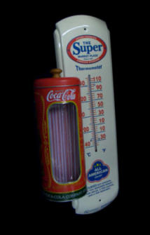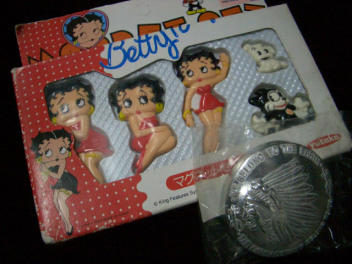 | やっぱ50's系グッズっていったら、ア〜タっ!ベティーちゃんは無視できないでしょう。隅田川を渡ると、駒形っというおもちゃの街があるんですなぁ〜。そこで、大発掘したレアなベティーちゃんマグネットだ! 販売元の郵便番号が3ケタでもあるからして昭和の時代の激レア(ホントは知らん!)なだけにハコは痛んでいるぞ。ついでになぜかインディアンのミラーもつけてしまおう。 | アメリカというと、コークのグッズも見逃してはならない存在ですなぁ〜。まだ瓶の時代、コークには甘口、辛口が存在するだの下町では話題になったもの!それだけでは寂しいので、いわば強引に温度計もつけてしまおう。ズルイ抱き合わせ販売ではなくあくまでサービスですぞ! | いよっ、待ってました!のELちゃんドール!あんま人気がないのでしょうかぁ〜\4200から\1000にプライスが変更されており、アタシャから言わせてもらえば、世界のエルヴィスプレスリーが粗末に扱われているようでジツに悲しいぞっ! その適当な手書きのプライスが何より物語っているのを見逃すわけがない。でもそのおかげで仕入れられた。要するに予算もあるわけだ。 | ||||||||||||||||||||