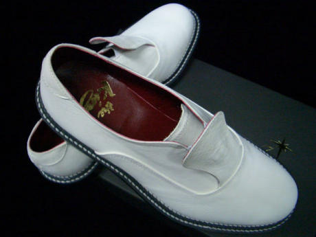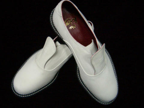| 長い月日を経てようやくナットクいくブツが完成致したゼ バックスキン製ホワイトのフラップ・シューズ 「エルヴィス・モデル」とでも呼んでほしいね ご承知の通りエルヴィスはRCAからメジャーデビューする以前 (時代で言ったら1954年頃) 黒人系のファッション・スタイルをガッツリ取り入れていて そのスタイルやパフォーマンスがソソられるよね イケてると思わない? モチロンTHE KINGもこの頃のスタイルを コンセプトに展開しているのはもう言うまでもないけどね 上の写真をよーく見てみるとアキラカに白 そしてツヤがナイ コレは当時チョッとイカシタ黒人の不良が好んで履いた ホワイト・バックスって言うリゾート・シューズなんです 成功したら南の島の別荘の砂浜で散歩する用 成功したらキャディラックで街をクルーズするみたいなね 発祥は17世紀とかなり古くて もとはとはと言えばイギリスのオボッチャマ オジョーサマの ゴヨウタシであったと聞くけど リクツじゃないんだよね これはもうロックンロールシューズでしょ! スェードをこまかーく磨くと何とも言いようのない ソフトな質感になりとてもデラックスなんだよね デリケートな素材だから雨や雪の日に履くと大変なコトになる ブラザー達はココイチバンのパーティやデート用の為にストックしておいてくれよ |