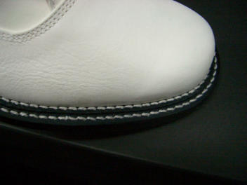 ←この先っちょのカーブも この素材のおかげでスゲー・セクシーだと思わない? 張り出したダブルコバはクロ ステッチは白 クロのコバに白のステッチが ホワイトバックスのダイゴミでソコ大事なトコ グッとくるよね クロのコバを職人さんが針で白い糸を通す… どう考えてもステッチはクロく染まっちゃうけど とうしても純白にしたくてこだわりました |