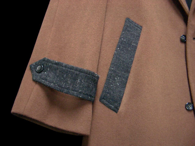 | ファラオコートだのに用いるメルトン調地をあえてロングコートにするとは恐れ入った! しかも切り替えにブラックネップ地を用いるとは、シンプル+ワンヒネリであ〜る。 |