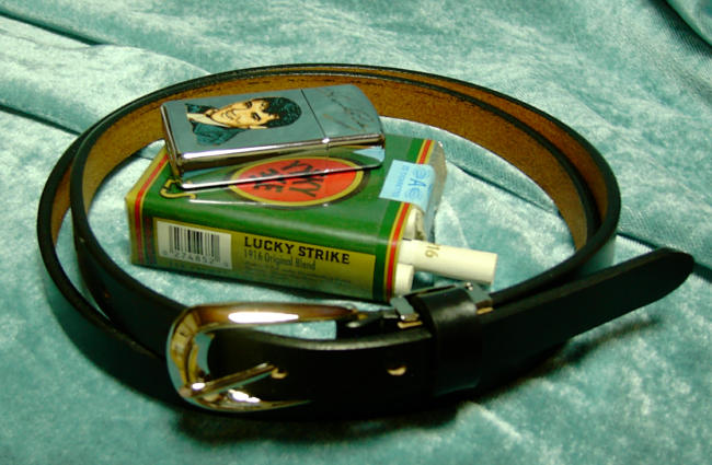 | 1.5Cm 細身ステッチベルト フリーサイズ(調整可能) かねてから、早く出しておくれやすぅ〜!!って言われ続けていた 「細身ベルト」、ようやく産声を上げました。ELVISみたいにあえて、 わき腰にずらすと、クールですねっ。 バックル部がギターにあたりキズを付けたくないという発想から、 このやり方をしたという説もあるのですが、こういうやり方&発想事態 に酔いがまわってくるのであります。自分流、オレ流があって良いです よね、ファッションはいつの時代でも自由ですから。一本持っておくと、 何かと役に立ちますよ。どうせなら、このハメ方、頂かせてもらいましょう。 牛革&スウェード製で確かなムードあり! 各 \3,990 (税込み) MADE IN JAPAN ジャックは強いので、メルシャン本搾りチューハイが、今はお勧めっス。 なんだかなぁ〜 |