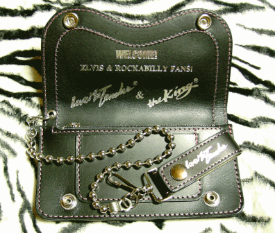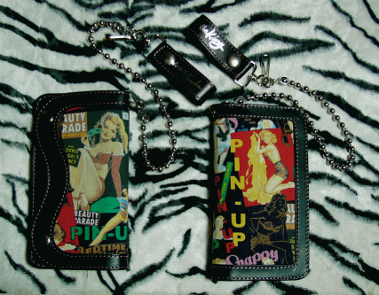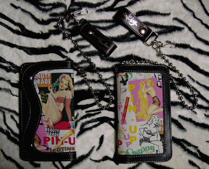 | ちょっと変わり種のサイフを探している方にお薦めしたいのがコレ! ピンクのステッチが効いたブラックレザーに、セクシーなピンナップガール達がプリントされた生地をあえて差し込んで製作したという、強烈に遊び心あふれるウォレット、その名もスバリっ、ピンナップガール・ウォレット。おもわず巷でチラつかせたくなるこのサイフは、原宿 LOVE ME TENDERとのジョイントによって完成し、断然テイストは50's&アメリカンなるものを意識して企画された。仕様においては、現代事情に合わせ、単なる札入れ&小銭入れというのでなく、奥にはキャッシュカードもしっかり入れられる箇所なども備えております。開くと「WELCOME! ELVIS & ROCKABILLY FANS!!」という熱いメッセージ入り! こうなると日々の買い物にもおもわずノリが出てきてしまいそうな、そんなゴキゲンなウォレットです。 現在、セクシーレディー達はクールな御主人様を募集中!ELVISやROCKABILLY FANS以外の方々にも幅広くお薦めできるフンイキ抜群のウォレットといえるでしょう。 ホワイト、ブラックタイプ共に数に限りありです。 SIZE 17.5p×10p チェーンは7mmの ボールチェーンを仕様 長さ30Cm TYPE.A WHITE TYPE.B BLACK TYPE.A B共にSOLD OUT! 各価格\8,190(税込) |