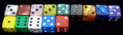 | 15mm〜16mm DICE (全22カラー) 上段より クリスタルダイス クリア、ミントブルー、イエロー、グリーン、ブルー2段目 パールダイス(マーブル調) レッド、パープル、ブルー、ホワイト、ピンク、ゴールド、レモン3段目 単色ダイス ブルー、ホワイト、オレンジ、グリーン、イエロー、レッド、ドクロダイス ブラック(めの色がレッド) ブラック(めの色がホワイト) |