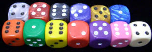 | 12mm DICE(全13カラー) 上段より パールダイス(マーブル調) ホワイト、レッド、ブラック、パープル、ゴールド、ブルー 2段目 単色ダイス オレンジ、グリーン、イエロー、レッド、パープル、ピンク、ホワイト |