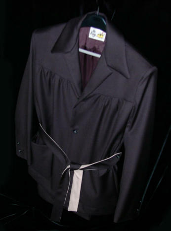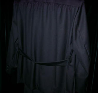 | フロントサイドの腰ベルト装着時。渋いブラッキーなギャバジンはオールシーズン仕様です。襟はこのようにイカのえんぺら型がCOOLとされている。また襟下の多数のギャザーが泣かせます。 | 左右のベルトを外しても、このようにボディーラインがキープできている為、ループを使うも使わないもその日の気分! | ||||||||||||||||