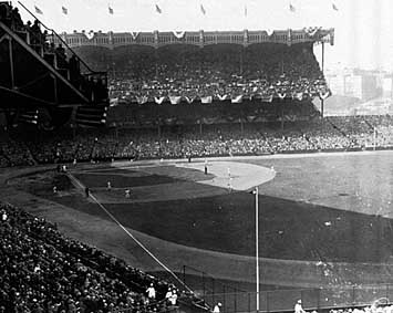 ■ Section-6 ホームラン狂騒時代■1920年代とは、ベースボールがアメリカで国民的な娯楽になった時代じゃ。 最大のヒーローは、伝説のホームラン・キングであるベーブ・ルースじゃ。 20年代以前のベースボールは、次の塁を奪うためのスピードとテクニックが試合の優劣を決っしておった。 ホームランはハプニングであり、ワンシーズンで10本も打てばホームラン打者と言われる時代だったのじゃ。 しかもその半分はランニング・ホームランであり、外野フェンス越えの打球なんつうのは滅多に観られんもんだったのじゃ。 そこに50〜60本もの大ホームランを一人でかっ飛ばすベーブ・ルースが登場してアメリカ中のファンが熱狂したのじゃ。 ノリのいいとある歴史学者の証言によると、ルースの登場は、約35年後のエルヴィス・プレスリーの登場と並ぶ、アメリカの歴史的な大事件だったらしい。 やがてルースを追随するホームランバッターも次々と現れ、ベースボールは「ホームラン競争、いや狂騒時代」となったのであ〜る。 ルースはたちまち大統領以上の破格の高給取りとなり、プライベートでは“大酒・大飯・夜遊び”に明け暮れていたらしい。 それでも子供や障害者のファンを大切にし、国民のホームランの期待に応え続けたルースはアメリカの歴史上に残る“キング・オブ・ヒーロー”となったのじゃ。 ルースの大活躍で懐がえろう潤ったヤンキースは、ルースの入団からわずか3年目の1923年に巨大なヤンキー・スタジアムを建設したのじゃ。 ヤンキー・スタジアムはまさに“ルースが建てた家”だったのじゃ。 スタジアム第1号ホームランもルースが打ってみせた! まさに偉大なり、ベーブ・ルース! 冒頭の球場の写真は、オープン当時のヤンキースタジアムの貴重なショットじゃ。 ■ Section-7 禁酒法時代のキング・オブ・ウイスキー ■
