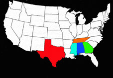 そろそろメンフィスが近づいてきたので、どこまで来ておるか地図で確認してみよう。 左の地図内でレッドがテキサス、ライトブルーがミシシッピー、ブルーがアラバマ、グリーンがジョージア、オレンジがテネシーじゃ。 テネシーの上はカール、いやカーネルおじさんで有名なケンタッキーじゃよ。 テキサスはデカイのお。 実際にこのような旅をしておったら、そろそろ旅の装いにも本腰が入ってくる頃じゃ。 ナッソーにピストルパンツ、それにロカタイなど、とっておきのヤツをトランクからおんどれゃ〜!って出さにゃあならんってとこじゃな。 ♪tune-6 メンフィス・テネシー/エルヴィス・プレスリー♪tune-7 ナッシュビル・スカイライン・ラグ/ボブ・ディラン いよいよお待ちかねのテネシー州メンフィスじゃ! この地ではもうこのナンバーを外すわけにはいかんじゃろう。 ここまで辛抱強く付いて来てくれた諸君にとって、とっておきの予定調和じゃもん な! 諸君なら死ぬほど聞いたと思うが、これを機に襟元を正してはいもう一度!さて、メンフィスばかりに気を取られていないで、テネシー州の州都ナッシュビルを放っておいたらいかんぞ! ここは60年代はカントリーミュージック系のストリートミュージシャンがうじゃうじゃいて、誰もがジョニー・キャッシュやボブ・ディランのバックバンドのメンバーになることを夢見ていた地じゃ。 そんな熱い情景を歌ったのが「ナッシュビル・スカイライン・ラグ」じゃよ。 「ラグrag」とは俗語で「ボロキレ、ビンボー野郎」とかいう意味じゃが、このタイトルはジョークじゃ。 同曲収録のアルバム「ナッシュビル・スカイライン」のオープニングナンバー「北国の女」(春ではないぞ!)はジョニー・キャッシュ大先生とディランのデュエットじゃ。 ![]() ♪tune- 8 アラバマ・ソング/ドアーズ、デヴィッド・ボウイ ♪tune- 9 アラバマ/ニール・ヤング ♪tune-10 スイート・ホーム・アラバマ/レイナード・スキナード アラバマ州は古くから白人にとっての理想的な古き良きアメリカがある!と言われてきた。 1962年にアカデミー賞に輝いた名画「アラバマ物語」にもそのことがよ〜く描かれておる。 ところが、これがロック系音楽に描写されると少々色合いが異なってきよるからオモロイ。 「アラバマ・ソング」は、原曲はヨーロッパの劇作家ブレヒトによって書かれた異色のナ ンバー。 「だ、誰かあ〜。 つ、次のウイスキー・バーを教えてくれえ〜。 そいつがダメ なら、もう一人カワイコちゃんを紹介してくれえ〜。 オイラのママが死んじまったんだぁ!」っつう悲しいヤケッパチ男の一曲。このナンバーが有名になったのはドアーズが67年にカヴァーしてからじゃ。 それにいたく感激したデヴィッド・ボウイは、78年に発表したニッポン賛歌「クリスタル・ジャパン」のシングルB面用に収録。 “カワイコちゃん”ってフレーズを“ダラー(お金)”に代えており、何ともいやしい一曲になっておった。 なんか香典詐欺みたいじゃな。なんて書くとデヴット゛ファンズからお叱りがくるので、いいアレンジだぁ〜。 ニール・ヤングの「アラバマ」は、人種差別の習慣の強い当地の政策を非難した 一曲であり、71年に発表されるやいなや、南部は大騒ぎとなって「ニール・ヤングは今後一切出入り禁止じゃあ〜」とアラバマのお役人を激怒させてしまったいわくつきのナンバー。 そしてそんな騒ぎを収拾するべく、「アラバマ良いトコ一度はおいでえ〜」と返してみせたアンサーソングが「スィートホーム・アラバマ」じゃ。 レイナード・スキナードやオールマン・ブラザース・バンドなど、ここら辺の南部出身のロックバンドたちは、70年代にはサザン・ロックと呼ばれたブームを巻き起こしておったもんじゃった。 何の因果が、レイナードもオールマンも、絶頂期において中心メンバーが次々と事故死してしまって、70年代後期にはサザン・ロック・ブームも下火になってしもうたのぉ。 “やっとこさミシシッピー、メンフィスくんだりまでやってきたぜ”-そんな曲が確かあったが、タイトルが思い出せん。 またスペースの関係で紹介出来ないナンバーもぎょうさんあるんで、なんか次の土地に移るのにも、後ろ髪を引かれる思いがするもんじゃ。 わし自身、アメリカのデカさ、地域ごとに根付いた曲の膨大な数に、あらためて驚いておるんじゃよ。 これはTHE-KINGのボスや8鉄先生にご協力を仰いで、シラミツブシに調べまくって資料にしてみたいもんじゃ。 日本語で翻訳された本で、そういうもんってまだないはずじゃ。 地域ごとのファッションの歴史なんかも同時に調べ上げていったら、音楽とファッションの気付かなかった関連性なんかも分かるかも知れん。 これはまだまだくたばれんな〜って、全部終わるまで寿命がもつかどうか?! まあええか、おかげ様で想像力の旅をしとったらわしも元気が出てきたわい! さあ、諸君もTHE-KINGのおNEWのパンツ4連発をゲットして、華やかな